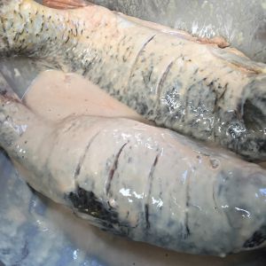 鱼划十字交叉纹,从中间劈开使其展开,缝中加入姜去腥,抹上盐,胡椒粉,倒入料酒腌制(时间越长越好)