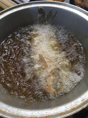 锅里放油烧热 把裹好面的鱼炸一下 因为要炸两遍 所以第一遍炸好稍微后放凉再炸第二遍