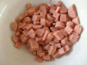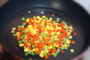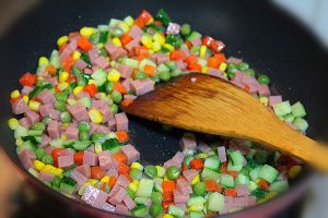 锅中加少许油,油热后将玉米、青豆、胡萝卜、黄瓜、香肠倒入锅中,加入少许盐煸炒匀后盛出备用。