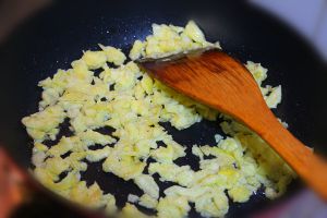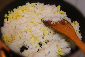 起锅烧油,下入鸡蛋翻炒,半凝固时加入米饭和杂菜,一起翻炒。