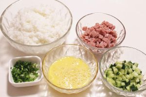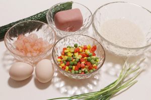 准备食材。泰国香米300克、胡萝卜丁适量、青豆适量、玉米粒适量、黄瓜适量、鸡蛋两个、香肠适量、虾仁适量、香葱适量。