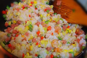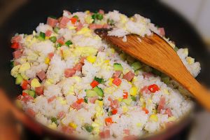 热锅热油,把蒜苔丁放入油锅内煸炒一会儿,在放入胡萝卜丁炒一会儿,最后放入火腿丁,加入少许酱油翻炒,最后把米饭倒入,撒入适量的食用盐,翻炒均匀。出锅
