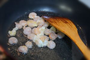 锅中加少许油,油热后倒入虾仁滑炒。虾仁变白成熟即可盛出备用。