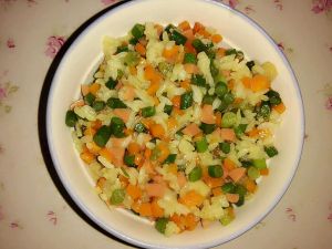 翻炒至杂菜完全化冻,而本来杂菜就都是熟的。 加入适量食盐,翻炒均匀。 待香气四溢,即可出锅。