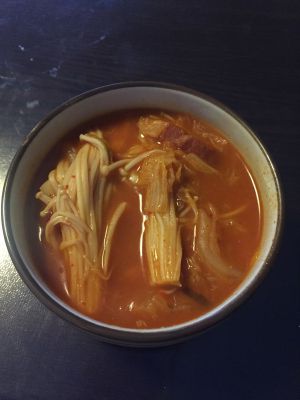 1、锅内加入3碗水,煮开后加入浓汤宝(牛肉浓汤)。 2、待汤块融化在水里后,加入泡菜、蔬菜、面煮两三分钟至面条熟透,再加入肥牛片、韩式辣酱、葱片、蒜片,煮半分钟左右至肥牛片熟透,即可关火盛入碗中。