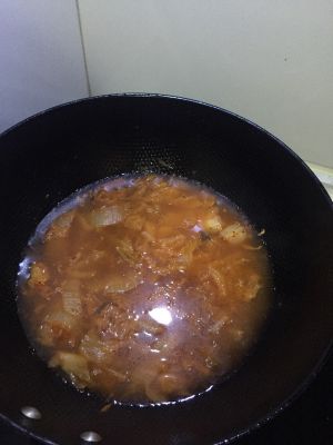 锅里放油,油热后炒泡菜(我没放肉,如果有肉就先炒肉然后再放泡菜),葱头也可以这会儿放,我不太爱吃就没放