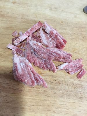处理食材。金针菇洗净,撕成条。培根切条。豆腐、土豆切小块。