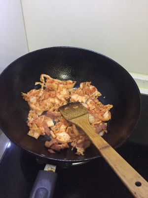 不放油。培根下锅翻炒,加入泡菜继续翻炒至变软。