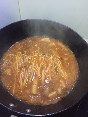 小火炖煮收汤,待土豆、年糕变软后,加入金针菇。
