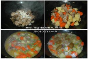 加入土豆继续翻炒,上色后,加糖,盐调味,因为咖哩酱是带咸味的,盐只要一小勺就可以了