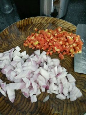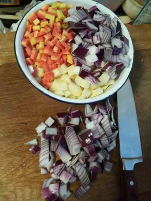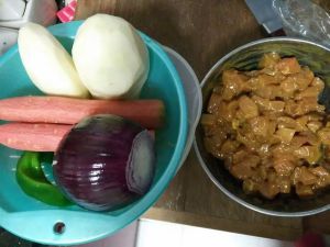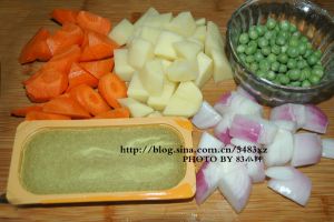 鸡大腿剁块洗净,加少许料酒稍腌。 土豆,胡萝卜去皮洗净切块。洋葱一部份切块,另一部份切碎末。