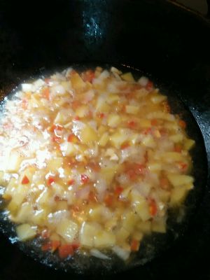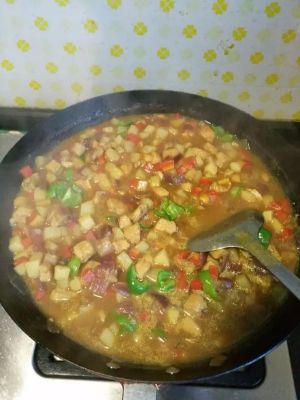 加水没过面,大火煮至水开,再转小火焖煮至土豆熟烂,大火收汁,放青椒翻炒一下,就可以了,最后一步忘拍了,请见谅