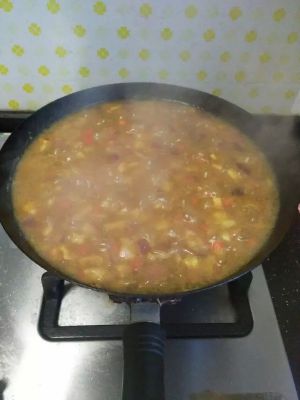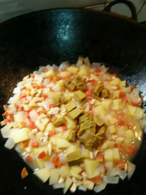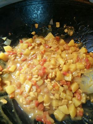 油热后先爆好鸡肉,鸡肉变色后倒入菜,盐,咖喱料(我用的一块,加二大勺粉。)再加没过菜的水,开始炖。