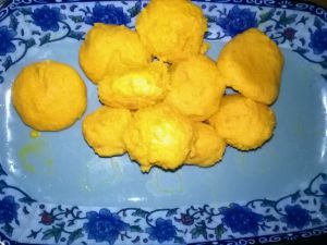 将南瓜上锅蒸熟,捏碎,然后一点点放入糯米粉,团成小团!