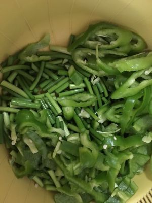 青椒、蒜苔洗净,切好备用