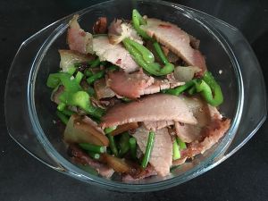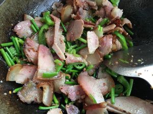 青椒、蒜苔翻炒变色放入切好的老腊肉同炒,起锅时加入少许味精调味,不用放盐,因为腊肉已经很咸了!