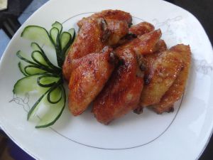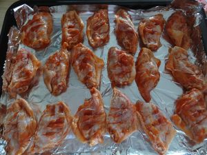 将烤盘取出,鸡翅翻面,再刷上一层蜂蜜水,重新放入烤箱内,上下会200度,十五分钟。