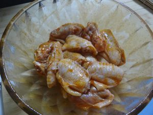 把调好的腌料同鸡翅一同放入一深盆内,稍加按摩后盖上保鲜膜放入冰箱腌制,最好腌制12小时~