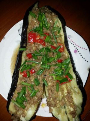 把蒜,肉,辣椒切碎和食用油,生抽,耗油一起搅拌均匀,涂抹在茄子上。