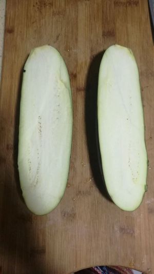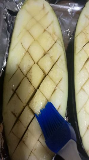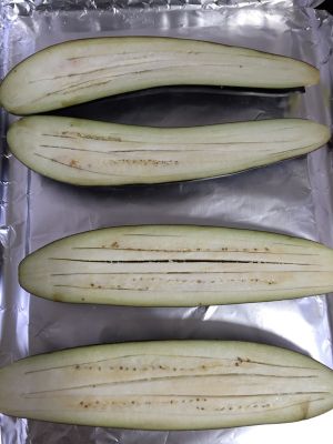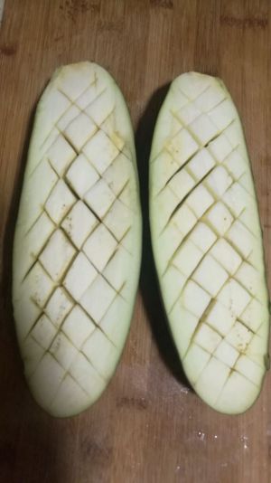 烤盘上铺锡纸,哑光面朝上。长茄子中间一切两开,用小刀如图在中间划几刀,注意别割透皮,茄子上撒盐,用手抹匀。