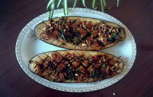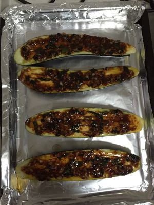 将肉沫与剩下的酱料拌匀,取出茄子,再刷一层酱料,再入烤箱烤十分钟