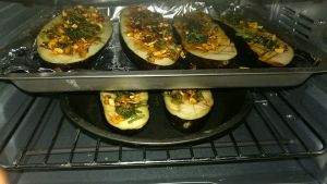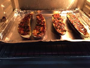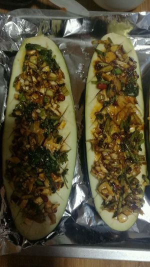 蒸好的茄子取出,刷一层油,刷上一大半酱料,烤箱200度预热五分钟,入烤箱烤十分钟