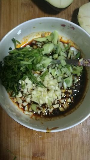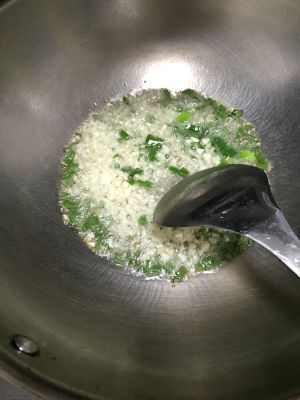 蒜、葱切末后,锅里烧油,放入爆香,出锅装碗。