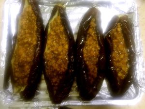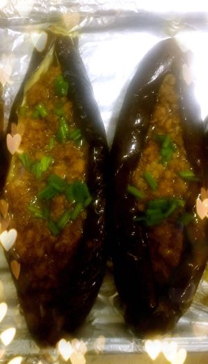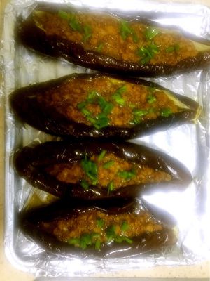 取出烤好的茄子,填入肉末蒜蓉酱,继续烤5分钟。