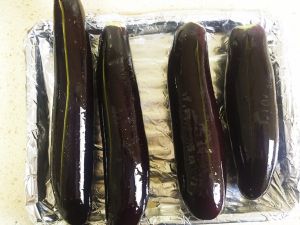 烤箱预热200度,茄子洗净剖开,两头不要断,烤盘铺锡纸。茄子刷上油,剖开的部分也刷上油,放入预热好的烤箱,烤20-25分钟。