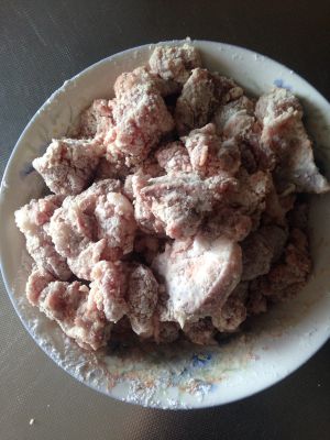 把小排热水洗过后沥干,裹上淀粉和少许盐