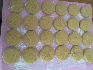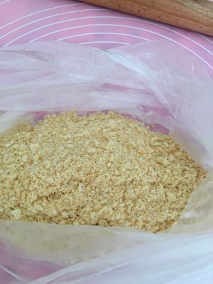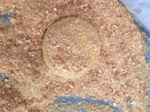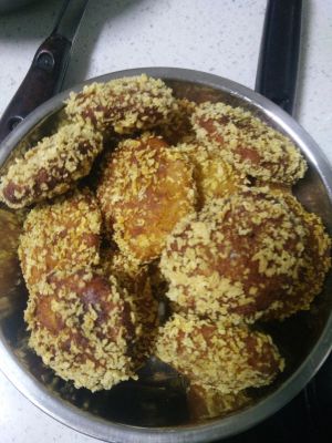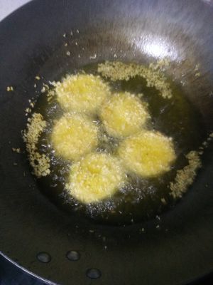 准备好面包糠,菜板上抹一点干糯米粉,把揉好的大南瓜团捏成小个的,一个一个的团子在用手掌压扁放面包糠里滚一下。放菜板上