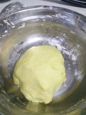 在搅拌均匀的南瓜泥里加入糯米粉,揉成光滑的面团(不要加水,要多加些糯米粉揉的硬一些,否则蒸时会塌下去)
