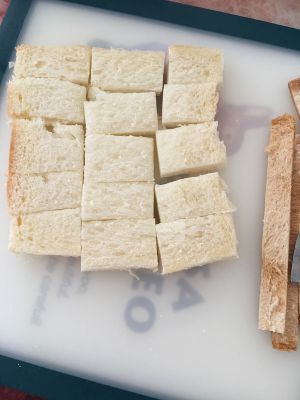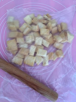 入烤箱中层130度烤制15分钟,吐司边也一起进去烤,烤出来脆脆香香很好吃(各家烤箱不同,脾气肯定也不一样,烤到一半要注意观察,不要烤焦了)