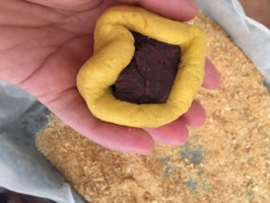 面团不用再静置,揉好直接取小团揉搓成圆压扁包入豆陷,面团往上推,包好搓圆压扁。