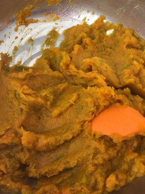 取出蒸熟南瓜过滤水,南瓜水可以喝很甜的,南瓜用勺子压成泥,加入白糖和糯米粉,糯米粉不要一次性加入,分批量加入拌均,因为很粘,建议刚开始不要用手,等面团成团后再用手揉几分钟。