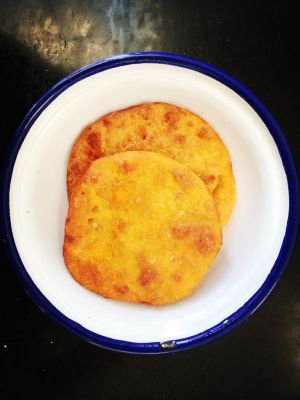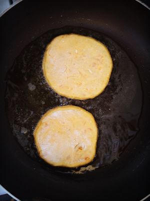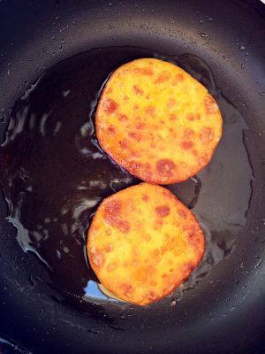 喜欢香脆口味的朋友可以用煎炸的方法,将油烧至刚有温度时就下锅,注意不要炸糊噢~注意翻转饼子~