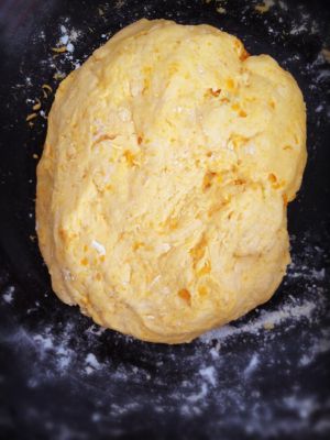 蒸熟的南瓜去皮凉透放进糯米粉内揉成面团并加少量糖
