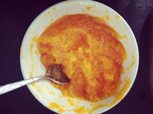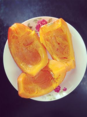南瓜去皮切片,放容器里盖盖高火4分钟就熟了,用勺子背儿碾成泥状。