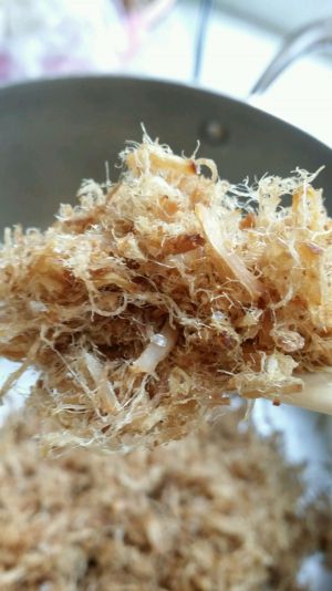 把瘦肉水分炒干就可以了!(炒的时候要用铲子边炒,边搓,更容易起绒,不要炒的太干了,要不然肉松会不起绒!)