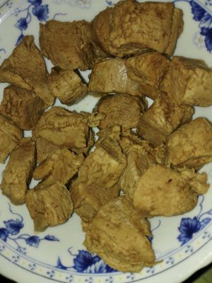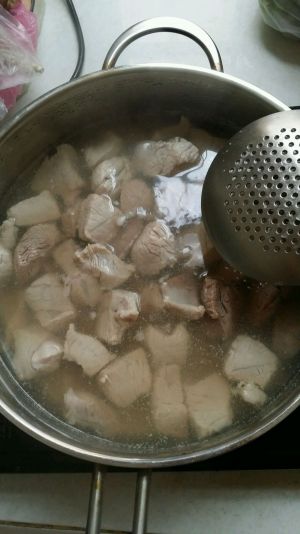瘦肉洗净切小块,烧开水后放入瘦肉,断生后沥出。