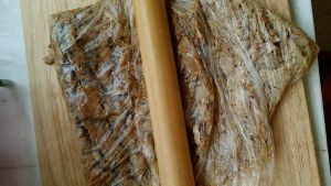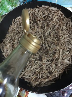 出锅后如果还有水分,收汁稍干,放到保鲜袋,用擀面杖擀碎。