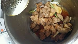沥出的瘦肉和所有配料入高压锅压15分钟(我家的高压锅压东西很快的,)压到可一捏就碎的程度。