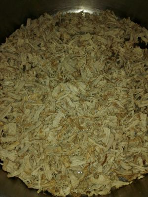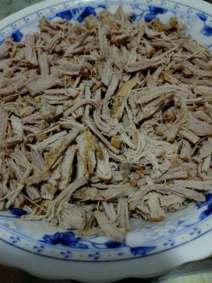 把煮好的瘦肉捞出来,稍微凉一下,用手把瘦肉撕成条!