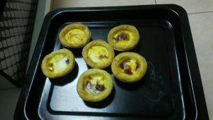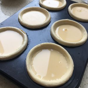 所有步骤准备好了,把蛋挞水放进皮里,放满也没关系,我实验了几次都没有溢出来还可以放进提前泡好的葡萄干,也可以放点蓝莓酱,味道都特别好!烤箱提前预热,上下火210度,我家的烤箱十分钟就好了,烤箱不同,时间也不同,所以要隔几分钟看一次,不要烤糊了!