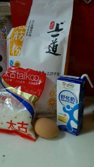 这些是所需要的材料,白砂糖,纯牛奶,低筋粉,鸡蛋!最主要的是蛋挞皮,因为没了,所以没展示!