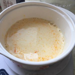 把牛奶里放入白砂糖,用隔水蒸的方法把白砂糖搅拌化