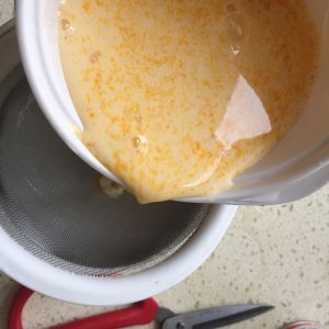 将蛋黄液打散倒入奶油混合物中,搅拌均匀