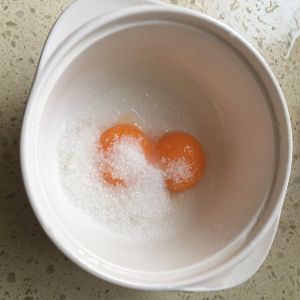 取两个蛋黄使用 加入15g砂糖 搅拌
