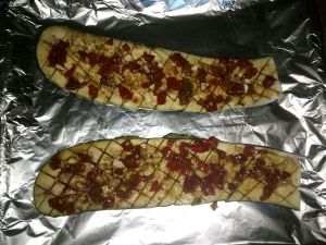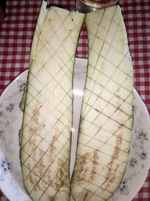 把打熟的茄子放在烤盘上每个茄子上用刀拉开口