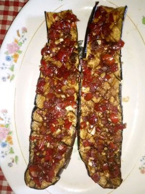 茄子出烤箱后用筷子把那切开的口子撑开,把我们刚调制好的酱料填进去,这个图是刚填上去的。填好后发现还有点汁,我就把它倒进烤盘里了。再进烤箱200度,十分钟